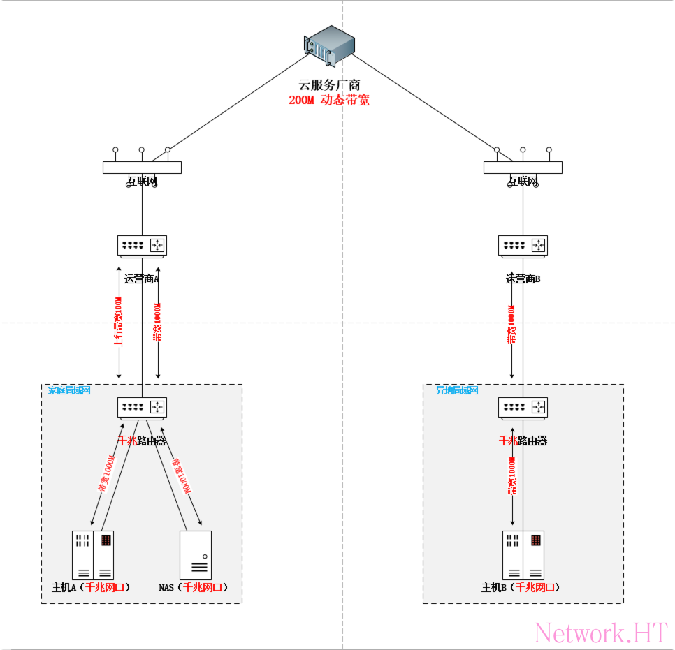内网穿透的大致拓扑如图所示,那么从主机B访问A地NAS时,影响速率的关键因素在于图内红色字体处,实际使用时速率为红色字体处带宽最低处的速率。