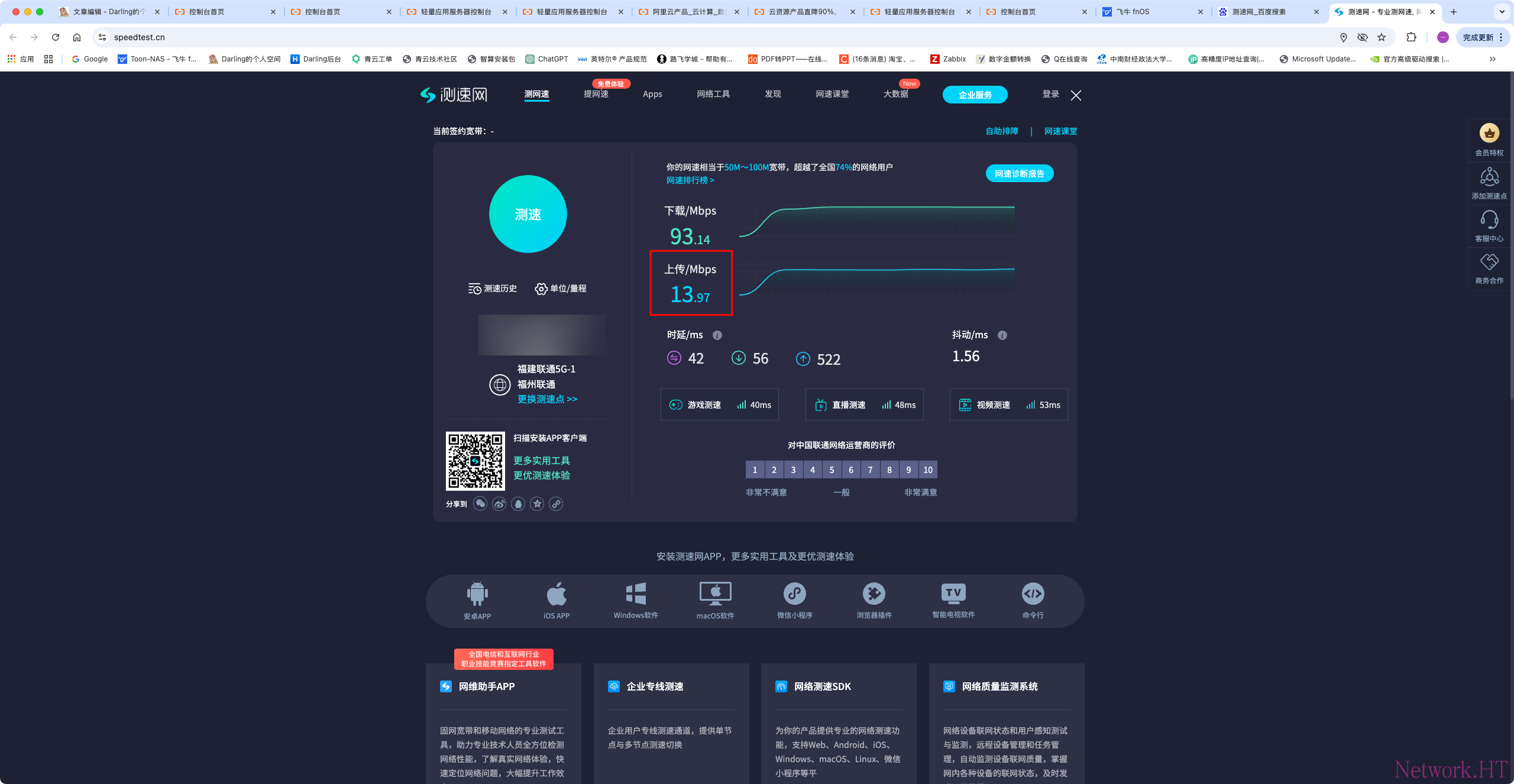 通过测速网测试家庭带宽的上行带宽,此处尤为重要,通常使用瓶颈不会在云服务厂商或者异地的下载带宽,而是家庭宽带的上行带宽,因此如果家庭带宽的上行带宽无法满足实际使用需求,那么就可以放弃搭建内网穿透了。