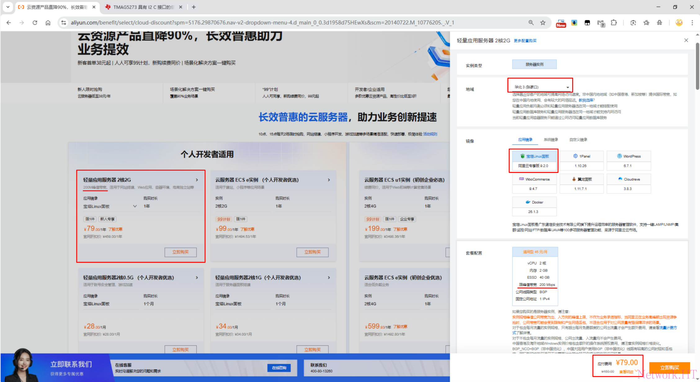 选择红框内的新人特惠产品,阿里云给每个未购买过此规格服务器的用户提供一次79一年的新人特惠