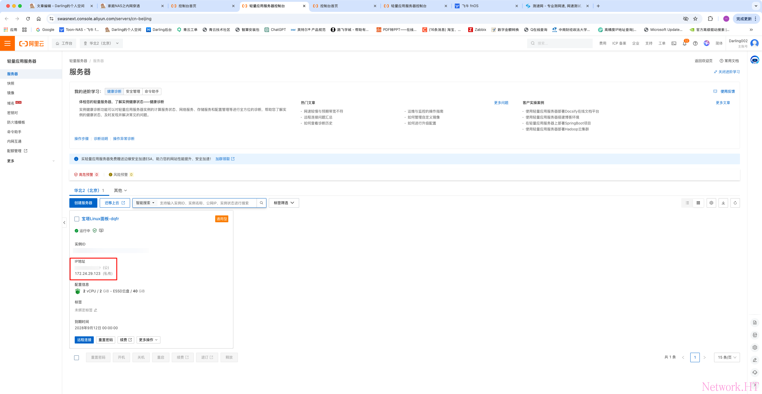 购买云主机后,等待云主机创建完毕,登陆阿里云官网进入控制台,点击轻量服务器跳转至轻量服务器控制台,并记录此处的公网IP,后续会用到。