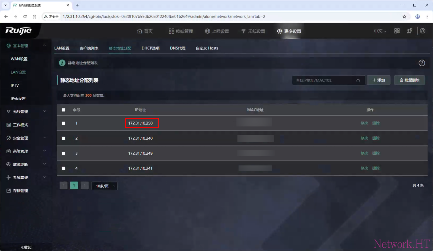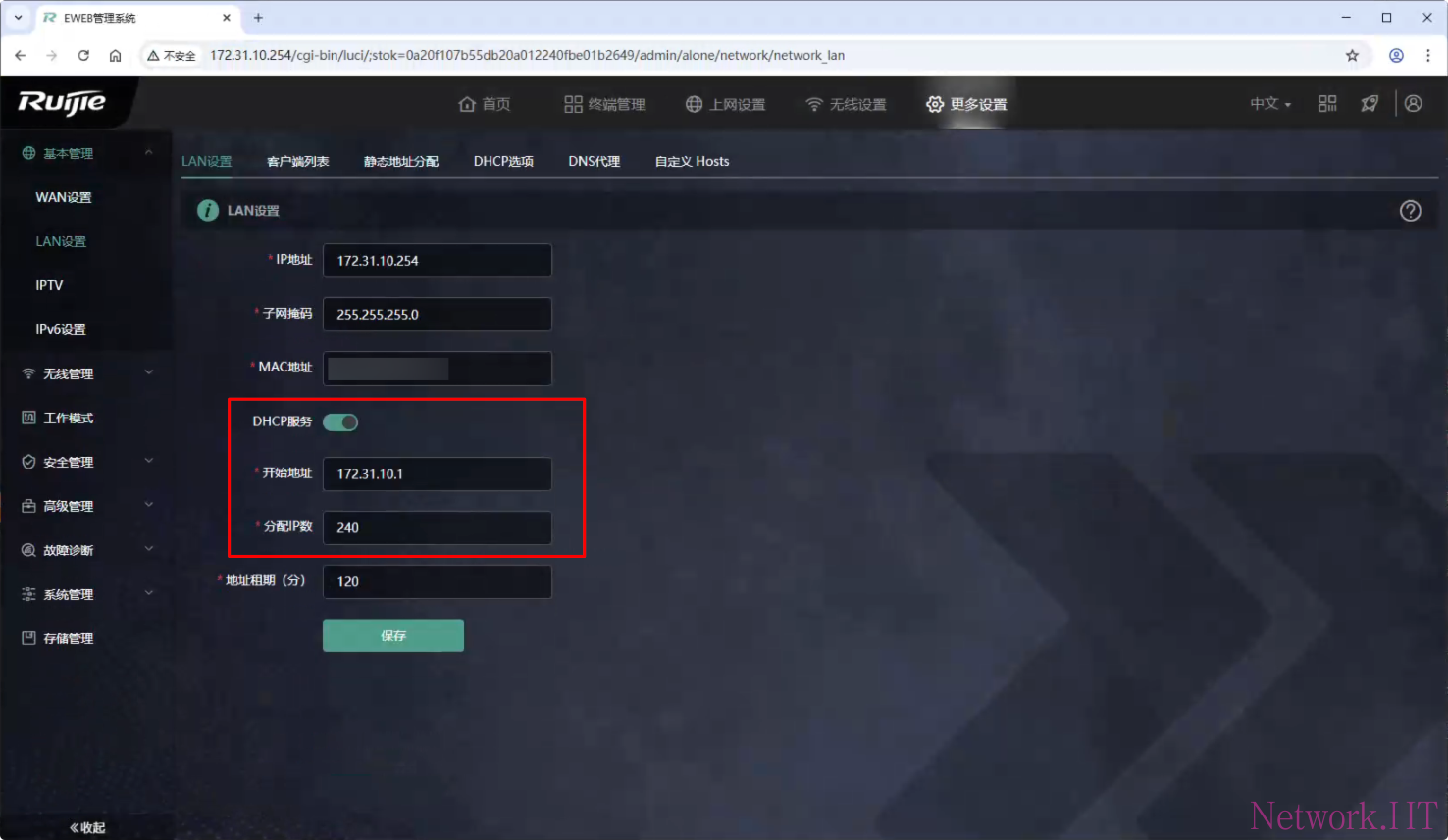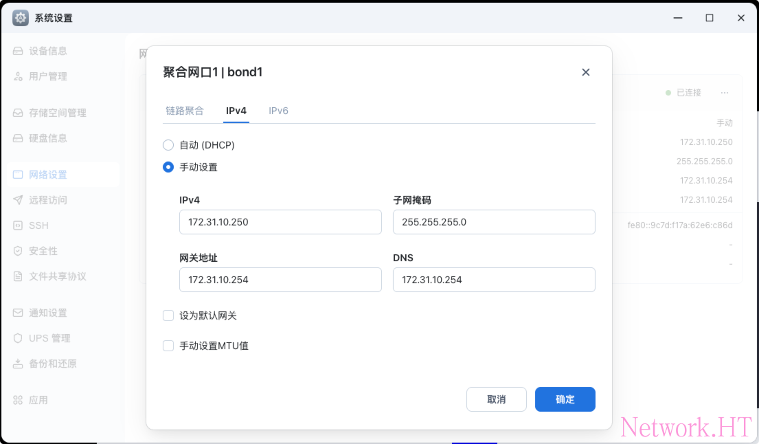 通常我们家庭无线路由器默认开启了dhcp功能,登陆到家庭路由器,将dhcp地址池修改为1-250(地址池大小可自行修改),推荐NAS使用静态IP地址,并绑定MAC地址,防止网络冲突,保证NAS使用的稳定性;NAS地址可以在系统设置-网络设置内进行修改。