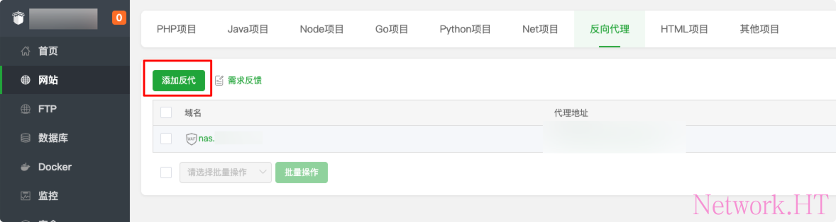 打开面板,点击侧边栏网站,选择反向代理,并添加反代,域名填写前置配置好的nas.xxx.com,目前填写https://公网IP:5667