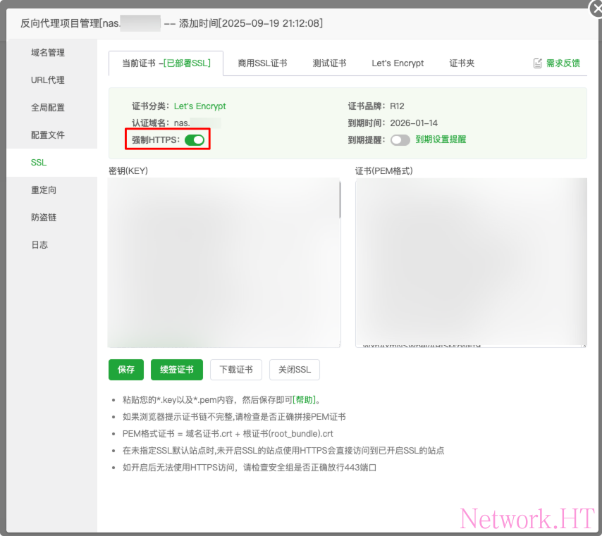 点击反代详情页,选择SSL,选择Let's Encrypt证书并申请,内容按照截图内配置,等待申请完毕后,单击部署,并在当前证书选择强制开启https。