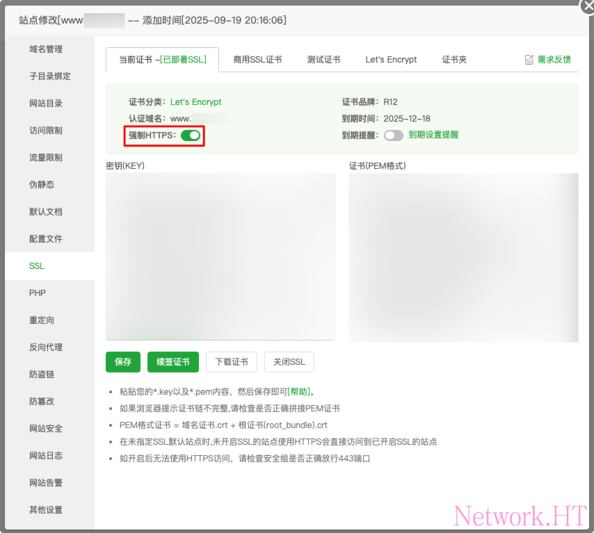 打开面板,点击侧边栏网站,选择www.xxx.com的站点详情页,选择SSL,勾选强制开启https。