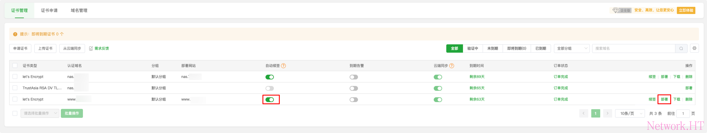 申请完毕后,打开面板选择SSL,勾选自动续签,并部署到www.xxx.com的站点。