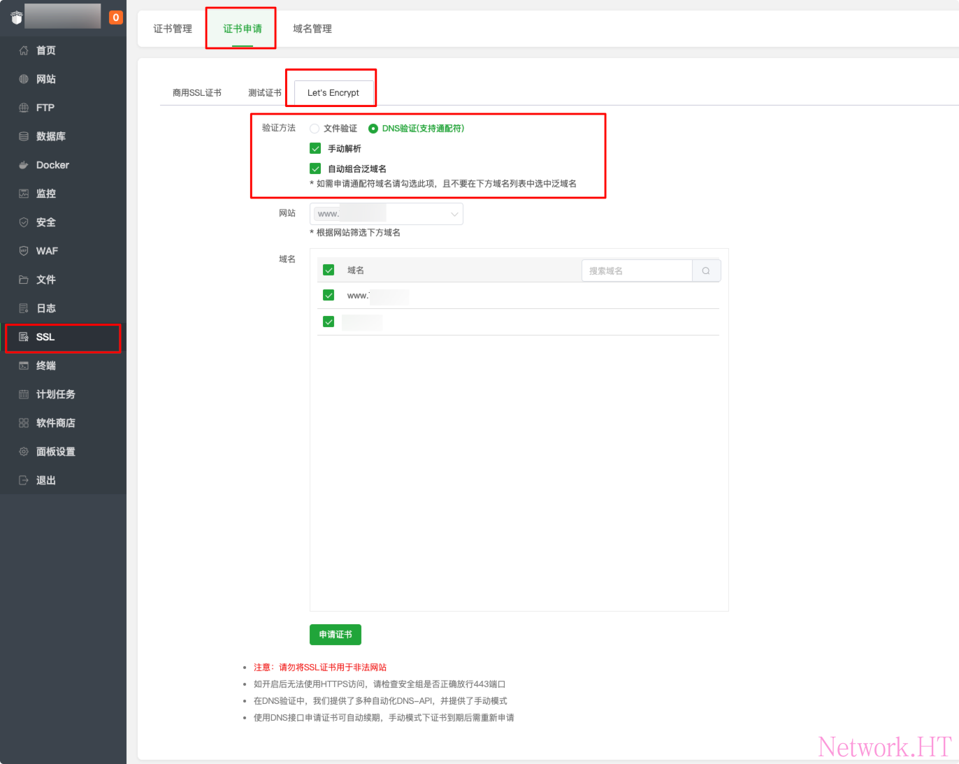 打开面板,选择SSL,选择证书申请下的Let's Encrypt证书,按照图内选项进行配置,然后申请证书。